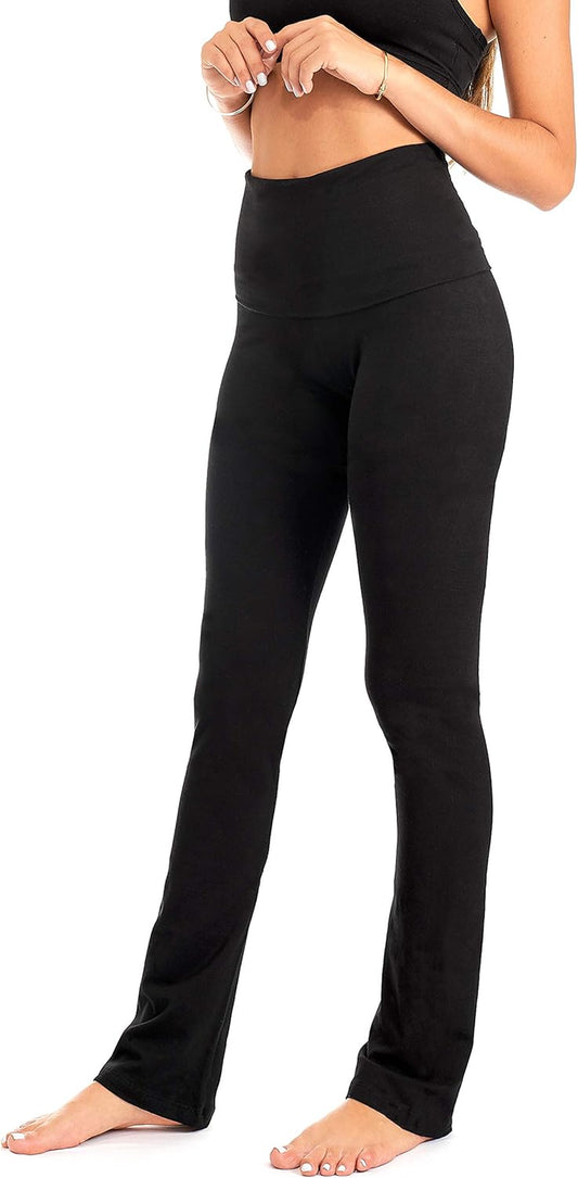 Bootcut Fold over Leggings for Women | Slim Look Bootleg Yoga Pants W Pocket + plus Size (C5 F)